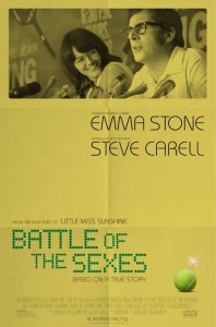 Battle of the Sexes is about the infamous tennis match between Billie Jean King and Bobby Riggs in the 1970s. It is written by Simon Beaufoy and directed by Jonathan Dayton and Valerie Faris. It stars Emma Stone (The Help and Birdman) and Steve Carrell (Can it get any better than 40 Year Old Virgin or Incredible Burt Wonderstone?) as well as Elizabeth Shue (forever tied to The Karate Kid) and Sarah Silverman (hilarious in A Million Ways to Die in the West).
