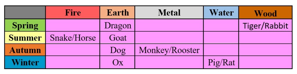 There are twelve signs and are based on year. The signs are Boar, Dog, Rooster, Monkey, Sheep, Horse, Snake, Dragon, Rabbit, Tiger, Ox, and Rat. Every sign is linked to the five elements of Metal, Earth, Fire, Water, and Wood.