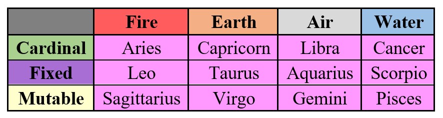 There are three modalities Cardinal belongs to Aries, Cancer, Libra, Capricorn. Fixed belongs to Taurus, Leo, Scorpio, and Aquarius. Mutable belongs to Gemini, Virgo, Sagittarius, and Pisces.