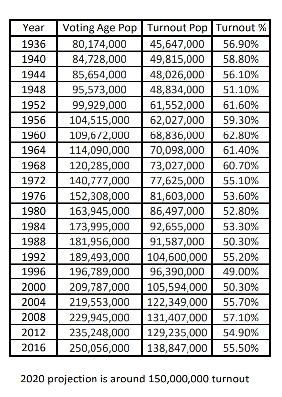 So what does this all mean? Nothing really. I just like putting together information such as this. In terms of U.S. voting stats, there were only three years where voting turnout percentage during presidential elections was above 80%. They were 1876, 1840, and 1860. The lowest voting turnout percentage were the years of 1920, 1924, and 1996 when it ranged from 48.9 to 49.2%. As you can see below, the U.S. isn’t that motivated to vote in recent years. We haven’t gotten to 60% turnout since 1968. Time will tell if we reach it this year. One can only hope.