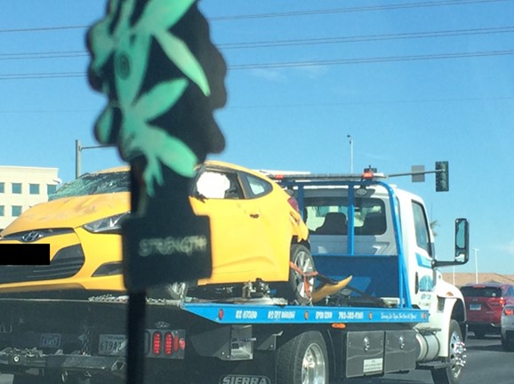 Okay, I don’t have a lot of time as I have to get on the road (highway), but as I was getting ice tea today, I ran across this. Yes, I was in the passenger seat so I was able to take a picture with my phone. It’s blurry but serves a purpose, nonetheless, and that is to slow down. As you can see in the picture below, the car was probably rear-ended as the bumper was completely off. It probably caused the hit another car, spin it around, and somehow flip upside down. In additional to the broken windshield, the license plates were from CA. That really doesn’t matter because NV drivers can be just as bad. I can pretty much back this up since living in the Las Vegas area. Nevada drivers are almost worse because they have the need to be ahead of you at all costs. I’ve had more cars in NV pass me, swerve into my lane, just to turn right in about 10 to 15 feet ahead. I kid you not. They are downright crazy nuts.