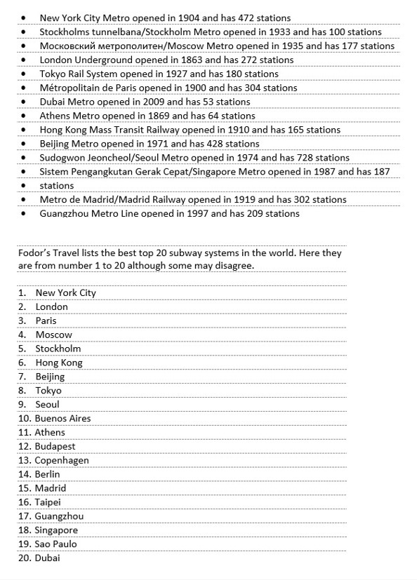 Because I watched an episode on a show about a terroristic plot that was foiled, I decided to look up the best and worst subway systems in the world. I wasn’t surprised that NYC was almost always in the top, if not the best, and that LA was one of the worst especially since living there and experiencing its lackluster. If you live in a city with millions of people, you will want to have some kind of transportation besides cars. I’m less familiar with subways in other parts of the world but from what I’ve seen some look terrible to ride on during rush hour while others offer great architecture and more. Here are some of the most notable subway systems in the world. Some run 24 hours a day like the London Underground, New York City Subway, and Copenhagen Metro. Sources include Fodor’s, Frommer’s, CNN, and Wikipedia. Frommer’s and CNN overlaps on their lists of the top ten subway systems as the best in the world so I ended up with 14 total and in no particular order.