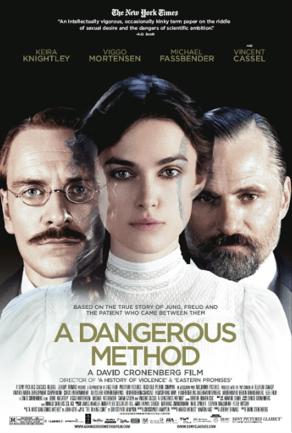 A Dangerous Method (2011) is about the relationship of Carl Jung, Sigmund Freud, and Sabina Spielrein. The movie stars Michael Fassbender, Viggo Mortensen, and Keira Knightley. It has a PG-13 rating and is one hour and 39 minutes. It is written by Christopher Hampton and John Kerr and directed by David Cronenberg.