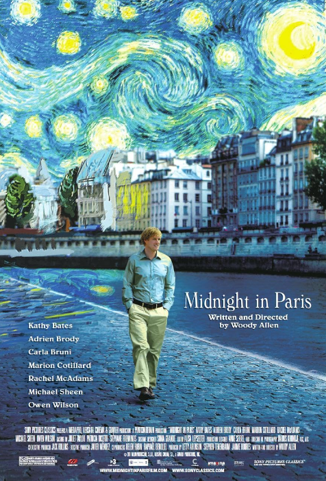 Midnight in Paris (2011) is about a writer that find himself transported back to the 1920s. The movie stars Owen Wilson, Rachel McAdams, and Kathy Bates. It has a PG-13 rating and is one hour and 34 minutes. It is written and directed by Woody Allen.