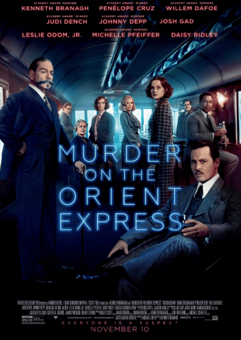 Murder on the Orient Express (2017) is about solving the murder of one of the guests on the train. The movie stars Johnny Depp, Kenneth Branagh, Judi Dench, Willem Dafoe, and Michelle Pfeiffer. It has a PG-13 rating and is one hour and 54 minutes. It is written Michael Green and Agatha Christie and directed by Kenneth Branagh.