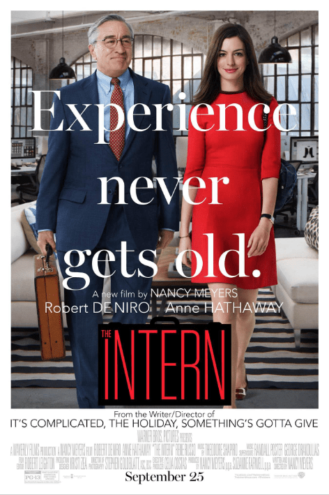 The Intern (2015) is about a retiree that wins a senior internship at a small business run by a career motivated woman. The movie stars Robert DeNiro, Anne Hathaway, and Rene Russo. It has a PG-13 rating and is two hours and 1 minute. It is written and directed by Nancy Meyers.