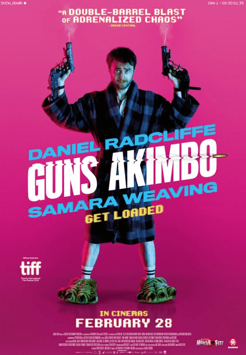 Guns Akimbo (2019) is about a computer programmer being kidnapped and having to fight his way out of his mess. The movie stars Daniel Radcliffe, Samara Weaving, and Ned Dennehy. It has a R rating and is one hour and 38 minutes. It is written and directed by Jason Howden.