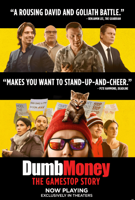 Dumb Money (2023) is about an everyday person giving investment tips to everyday people. His followers start earning money until billionaires put a stop to this money-making operation. It stars Paul Dano, Pete Davidson, Vincent D’Onofrio, America Ferrera, Nick Offerman, Anthony Ramos, Seth Rogen, Talia Ryder, Sebastian Stan, Shailene Woodley, and Kate Burton. It is rated R and one hour and 45 minutes