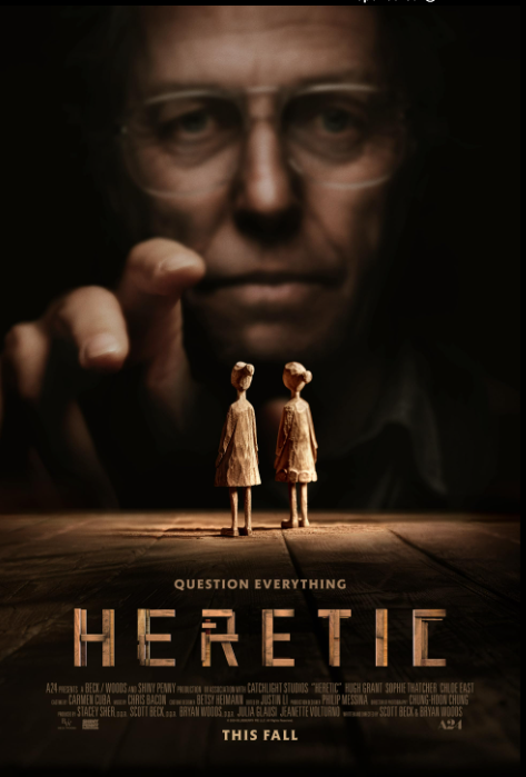 Heretic (2024) is an R rated movie about two women Mormon missionaries forced to survive a game played by a middle-aged man that likes blueberry pie. The running time is one hour and 51 minutes and directed by Scott Beck and Bryan Woods. The movie stars Hugh Grant, Sophie Thatcher, and Chloe East.