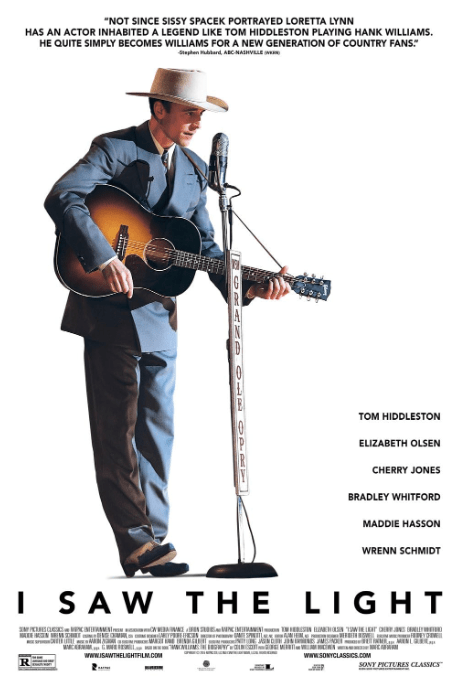 I Saw the Light (2015) is an R rated movie about country singer Hank Williams and impact on American music. The running time is two hours and three minutes and directed by Marc Abraham. The movie stars Tom Hiddleston, Elizabeth Olsen, Cherry Jones, David Krumholtz, and Bradley Whitford.
