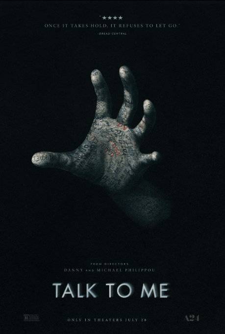 Talk to Me (2022) is about teenagers conjuring spirits until supernatural forces make them do dangerous things. It is directed by Danny and Michael Philippou and written by Danny Philippou, Bill Hinzman, Daley Pearson. The cast includes Miranda Otto, Ari McCarthy, Sophie Wilde, Joe Bird, Marcus Johnson, Alexandra Jensen, Jude Turner, and Zoe Terakes. It is rated R and runs one hour and 35 minutes.