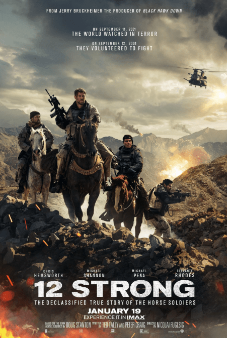 12 Strong (2018) is based on the true story about a Special Forces team working with an Afghan warlord to take down the Taliban. It is directed by Nicolai Fuglsig and written by Ted Tally and Peter Craig. The cast includes Thad Luckinbill, Lauren Chavez-Myers, Elsa Pataky, Michael Peña, Michael Shannon, Geoff Stults, Navid Negahban, Chris Hemsworth, Allison Gabriel, Kenneth Miller, Austin Stowell, Austin Hébert, William Fichtner, Trevante Rhodes, Ben O’Toole, and Rob Riggle. It is rated R and runs two hours and 10 minutes.