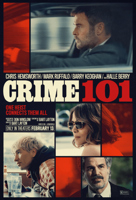 Crime 101 is adapted from Don Winslow’s book and screenplay written by Bart Layton. It is rated R and runs 140 minutes. The movie is about a LAPD detective (Lou Lubesnick played by Mark Ruffalo) in the middle of solving a string of heists taking place near the 101 freeway. Lou works with his partner (Tillman played by Corey Hawkins) to find ab experienced criminal (Mike Davis played by Chris Hemsworth) having reservations about his career choices. Davis meets two women, each serving different purposes. One is an insurance broker (Sharon Colvin played by Halle Berry) that forms a one-time transactional arrangement. The other is his love interest (Maya played by Monica Barbaro). Intertwined in all of this is Lou’s failing marriage to his wife (Angie played by Jennifer Jason Leigh), Sharon’s unsupportive boss (Mark played by Paul Adelstein), overly ambitious criminal to prove himself (Ormon played by Barry Keoghan), black and white police captain (Stewart played by Matthew Del Negro), and cut-throat crime boss (Money played by Nick Nolte).